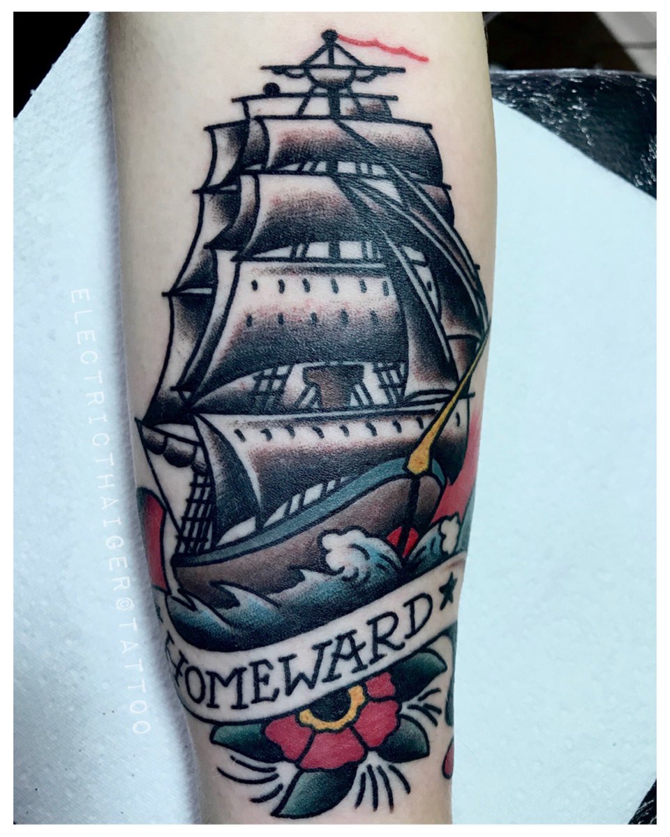 This Tattoo Features An Antique Ship Riding The Waves Of A Wild Sea Behind The Ship Is A Red Sun A Gr Sailor Jerry Tattoos Tattoos For Guys Red Bird Tattoos